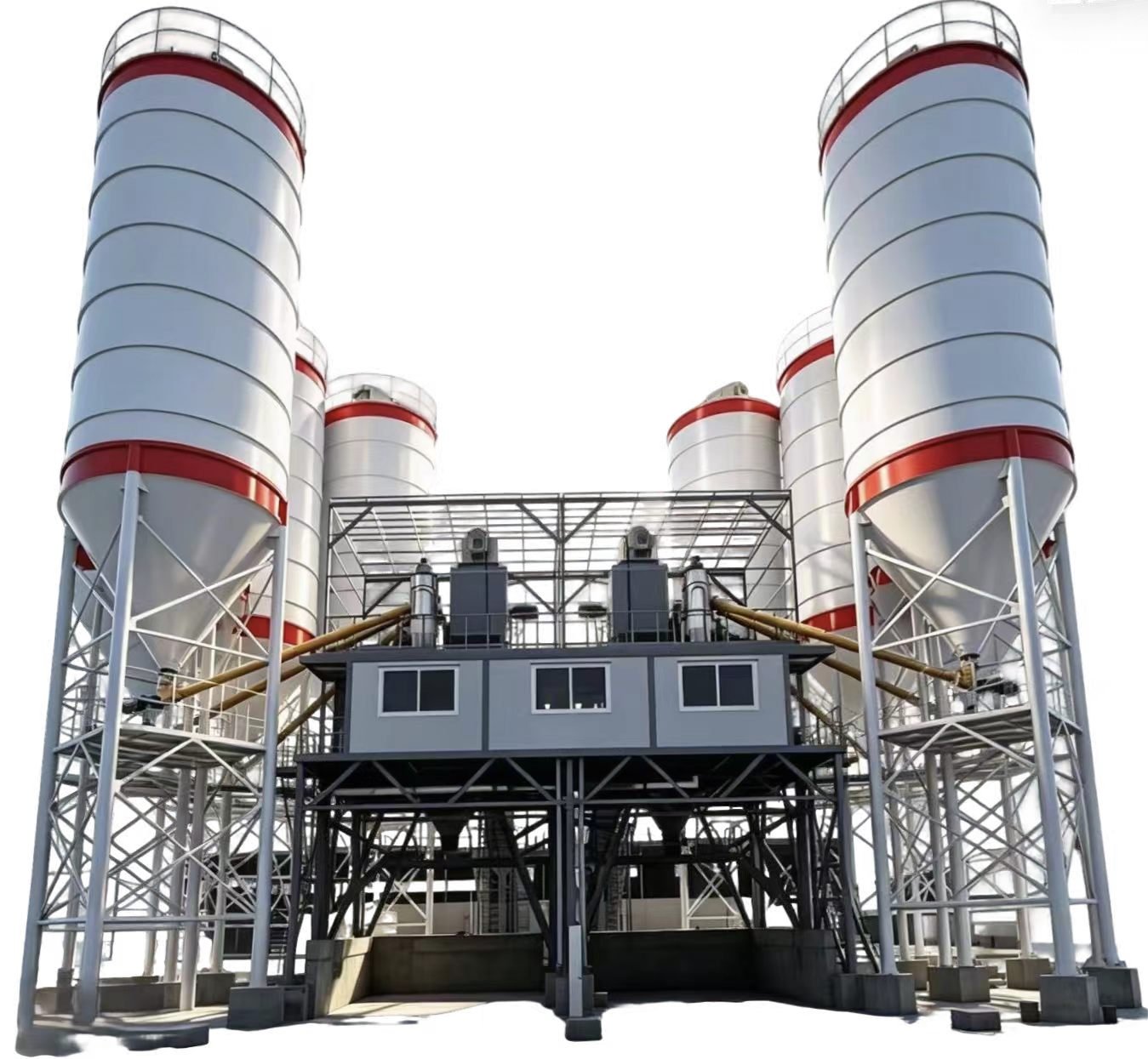 Consists of enclosed aggregate bins, dust‑proof cement silos with arch breakers, and corrosion‑resistant additive tanks, providing safe and stable storage for all raw materials.