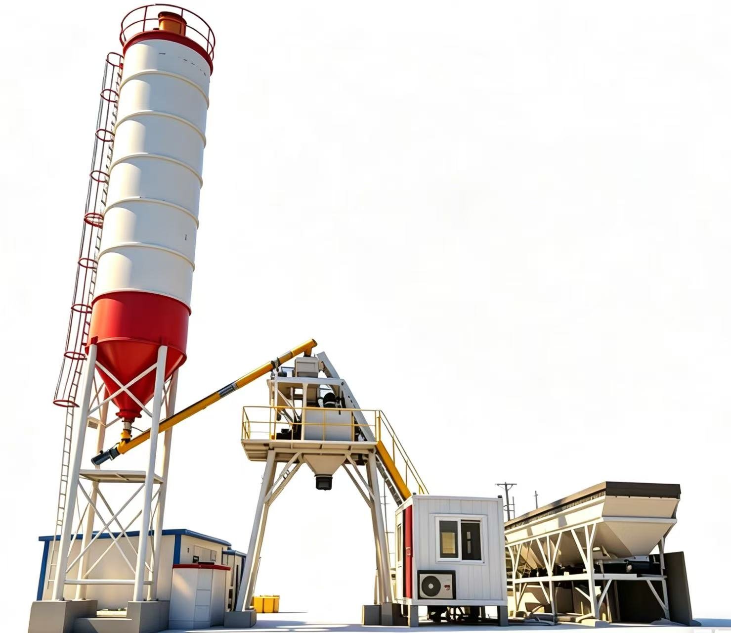 Includes dedicated aggregate storage bins, sealed cement silos, and anti‑corrosion water and additive tanks. Closed structure reduces dust emission and raw material loss, ensuring safe and stable storage of all materials.